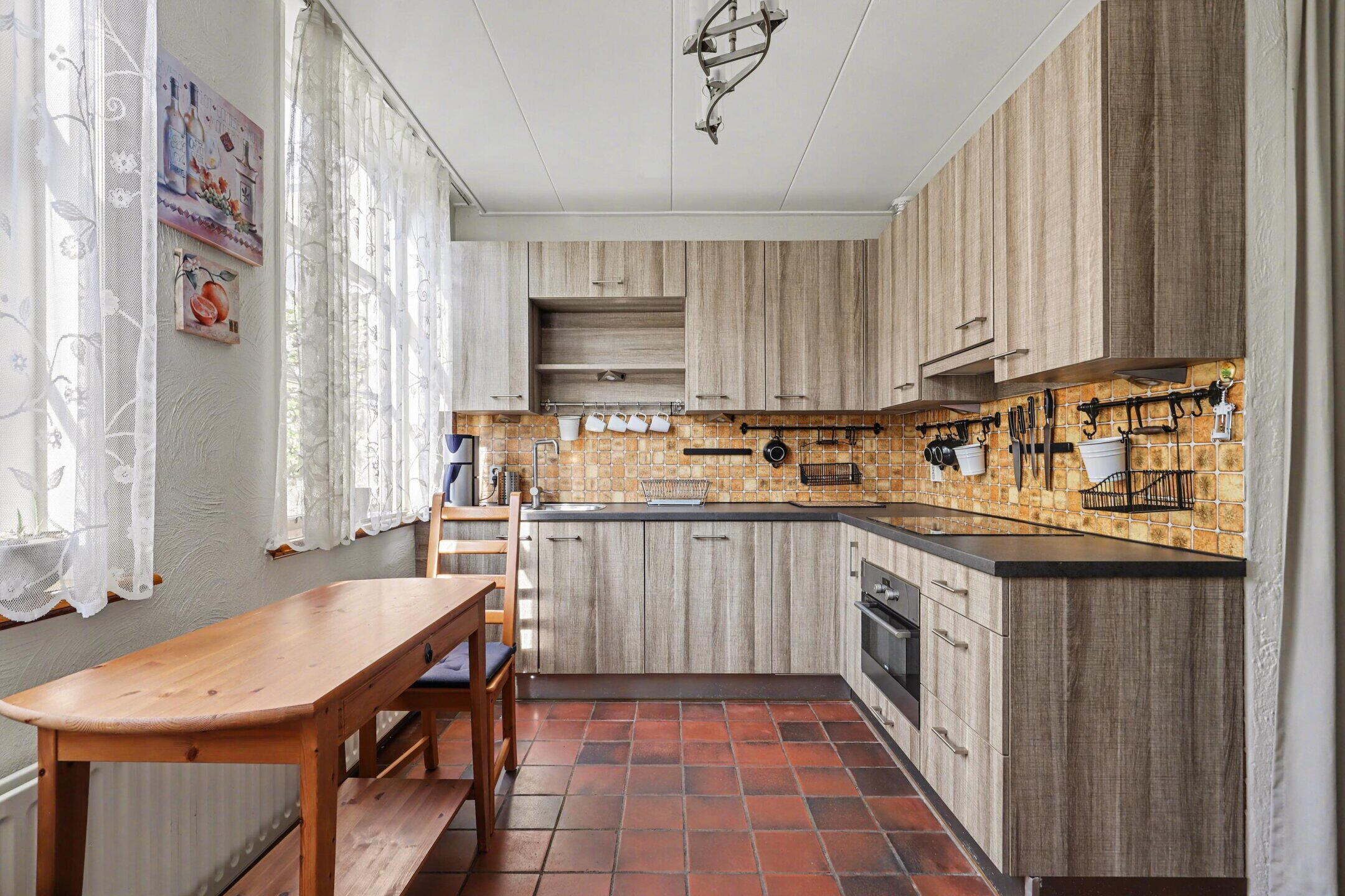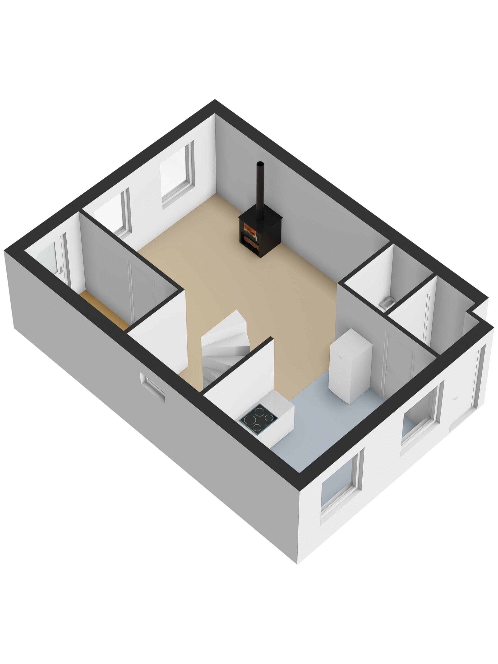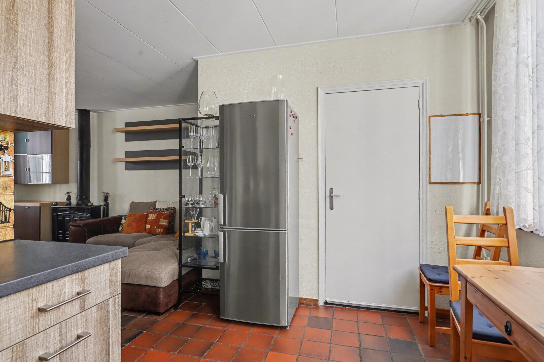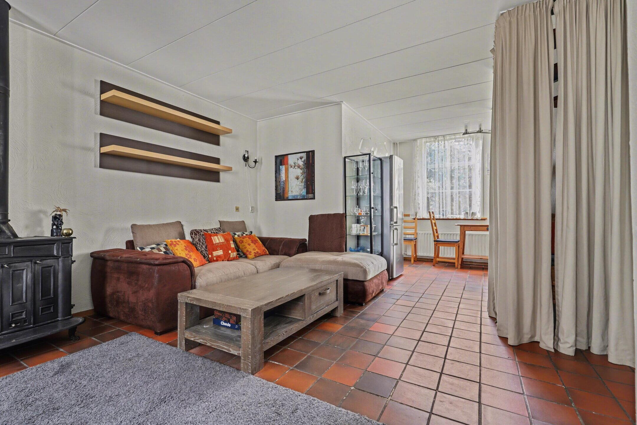 koel-vriescombinatie, combimagnetron/heteluchtoven, kookplaat en afzuigkap. De woonkamer heeft een gezellige zithoek rond de houtkachel aan de voorzijde.