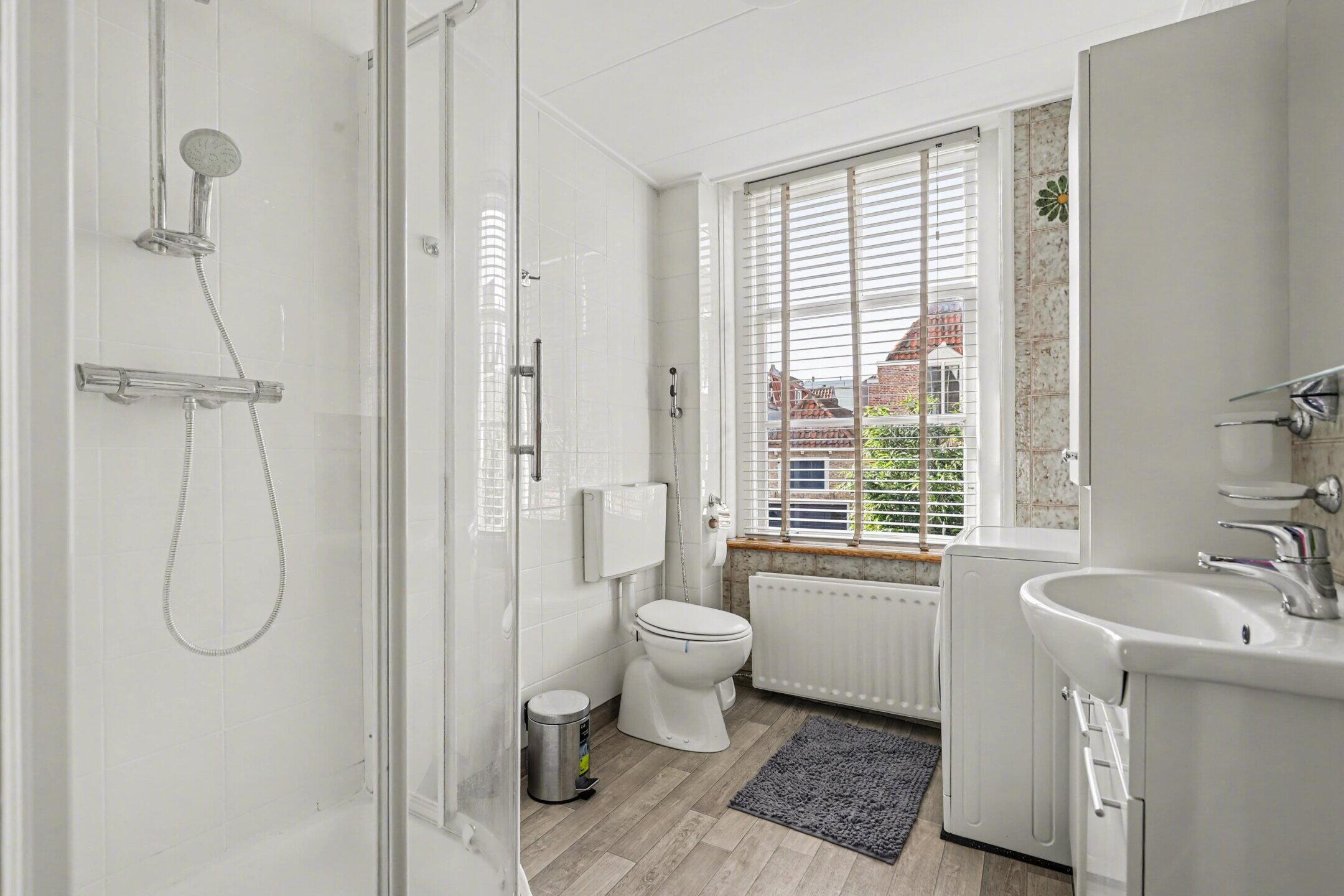 De badkamer is voorzien van een tweede toilet, douche, wastafel met spiegel, wandkast en een witgoedaansluiting.